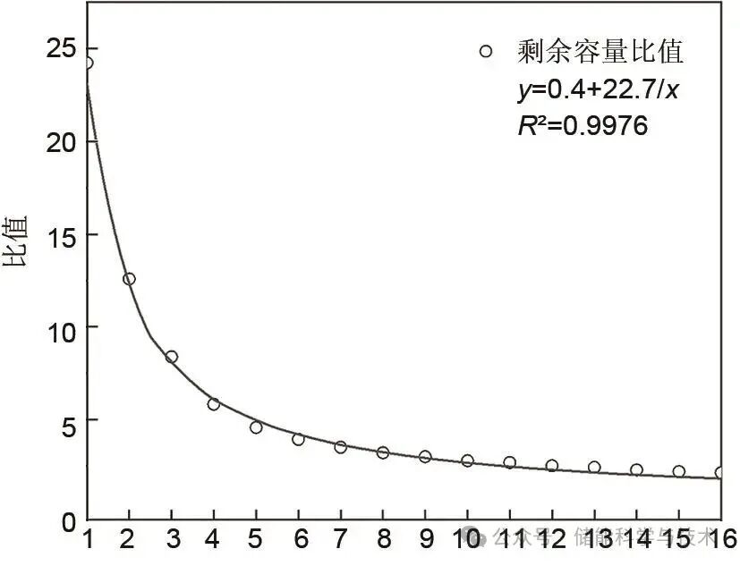 為了繼續(xù)探究環(huán)境溫度對儲能電池循環(huán)性能的影響,本工作將兩次循環(huán)試驗的容量衰減率平均值的比值進行函數(shù)擬合。圖4為45 ℃與25 ℃容量衰減率比值,由圖可知,由于常溫測試的容量在初期階段先增加了一段時間后才緩慢衰減,因此比值較大,隨著循環(huán)圈數(shù)的逐漸增加,高溫容量衰減率逐漸趨于常溫容量衰減率的2倍,且曲線近似反比例函數(shù)與常數(shù)的和(y=a+b/x)。為簡化擬合方程,將橫坐標250圈定義為1,300圈定義為2,以此類推,1000圈定義為16,函數(shù)擬合結(jié)果如圖5所示。在擬合方程y=a+b/x中,a=0.4,b=22.7,相關(guān)系數(shù)R2=0.9976,表明函數(shù)擬合結(jié)果較好。由于本試驗采用的兩種環(huán)境溫度均嚴格參考了GB/T 36276標準中的規(guī)定,因此試驗結(jié)果不僅能夠準確反映電池在該標準條件下的性能表現(xiàn),還對其他參考該國標進行的循環(huán)試驗具有重要的預測作用和參考價值。研究結(jié)論可為電池制造商、檢測機構(gòu)以及相關(guān)研究人員提供可靠的數(shù)據(jù)支持,幫助優(yōu)化電池設(shè)計和測試方法,同時為制定和修訂相關(guān)行業(yè)標準提供科學依據(jù),從而推動電池技術(shù)的規(guī)范化發(fā)展。