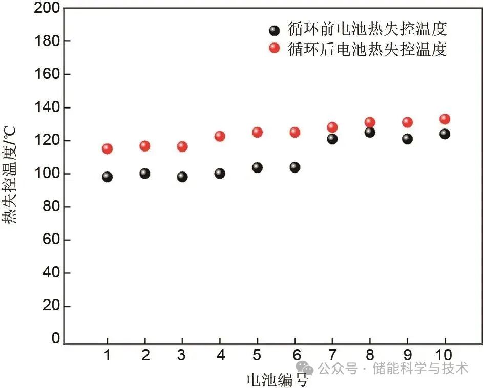 為了探究循環(huán)前后的儲能電池熱失控溫度的關(guān)系以及循環(huán)后SOH與熱失控溫度之間的關(guān)系,本工作選用來自5個企業(yè)的10款電池,每款電池選取2個(共計20個)分別進行循環(huán)前和循環(huán)后的熱失控試驗。圖6為循環(huán)前后電池發(fā)生熱失控時的最高溫度,由圖可知,經(jīng)過高溫加速老化1000圈充放電循環(huán)后的電池熱失控溫度普遍高于循環(huán)前的新電池,熱失控溫度分布相對集中,均在115~135 ℃之間,而循環(huán)前電池的熱失控溫度分布于95~125 ℃。熱失控溫度的顯著差異主要歸因于電池在循環(huán)過程中內(nèi)部組件(如正負極材料、隔膜和電解質(zhì)等)發(fā)生的結(jié)構(gòu)或物相變化,導致其在熱失控試驗過程中擁有更高的溫度觸發(fā)熱失控。在鋰離子電池循環(huán)過程中,負極表面的SEI膜會隨著充放電循環(huán)不斷生成并逐漸增厚。這些積累的SEI膜在熱失控試驗中會釋放更多的熱量,熱量會進一步加速剩余SEI膜的分解,形成惡性循環(huán),導致循環(huán)后的電池溫度在短時間內(nèi)迅速升高至115~135 ℃,同時SEI膜的分解還會產(chǎn)生多種氣體產(chǎn)物,主要包括CO2、C2H4和O2等,使得電池內(nèi)部壓力急劇上升,最終導致電池進入不可逆的熱失控狀態(tài)。因此,深入理解循環(huán)后鋰離子電池狀態(tài)以及SEI膜在熱失控過程中的作用機制,對于后續(xù)開發(fā)有效的熱失控預警和防護策略具有重要意義。