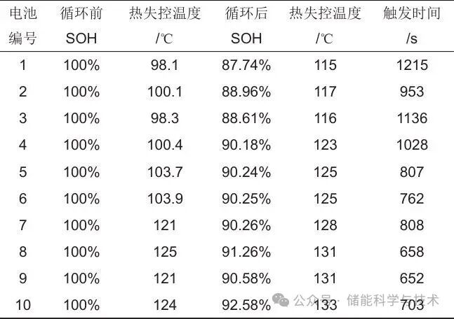 (2)安全性能測試結(jié)果表明,經(jīng)過一段時間循環(huán)測試的舊電池與新電池相比熱失控溫度更高,并且熱失控溫度與SOH具有一定的比例關(guān)系,二者比值(熱失控溫度/SOH)為130~145,即通過測定電池循環(huán)后的SOH可對其安全性能做出較準確的評估。