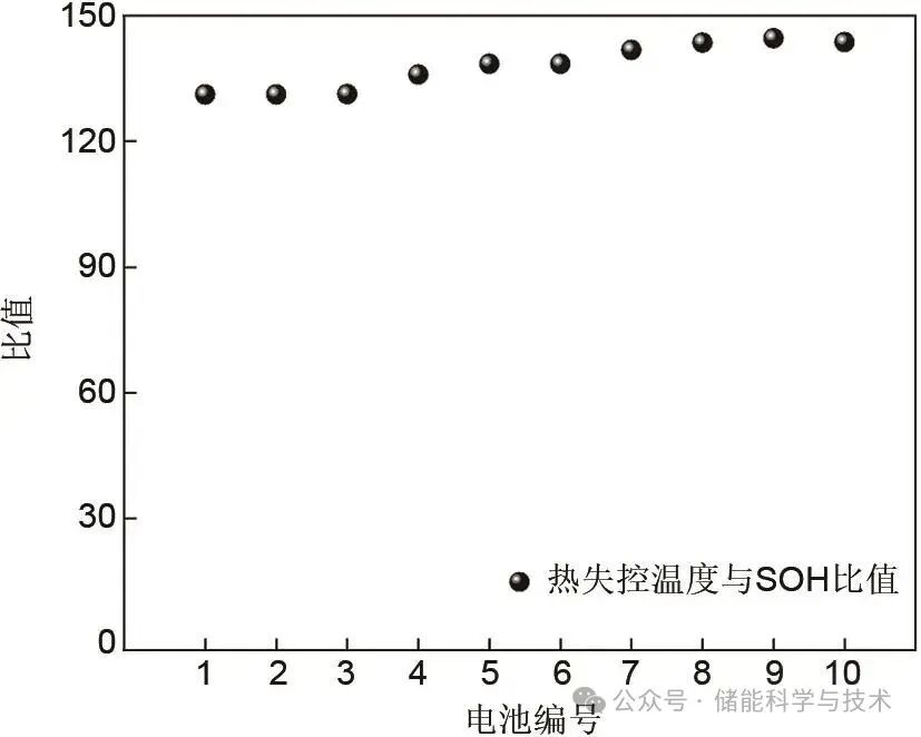 一般來說,鋰離子電池在充放電循環(huán)一段時間后均會發(fā)生容量衰減,造成SOH降低,從而對熱失控溫度造成一定影響。本工作進一步探究SOH和熱失控溫度的關(guān)系,測試結(jié)果如表2所示。圖7是10塊電池經(jīng)過1000次充放電循環(huán)后的SOH,SOH均保持在(90±3)%之間,平均值為90.07%。計算熱失控溫度與SOH的比值,計算結(jié)果表明該比值均在130~145之間(圖8),具有較好的一致性,即通過測定循環(huán)后電池的SOH,可以間接評估電池的熱穩(wěn)定性,并大致估算其熱失控溫度,從而顯著提高試驗人員對電池安全風險的監(jiān)控能力。結(jié)合SOH與熱失控溫度的關(guān)聯(lián)分析,還可為電池的壽命預測、維護周期制定以及退役標準提供科學支持,進一步提升儲能系統(tǒng)的安全性和可靠性,為電池的全生命周期管理提供有力保障。在儲能電池的實際應用過程中亦可為長期使用的電池安全性能評估提供一定參考,為儲能電站建立基于壽命衰減狀態(tài)的分級安全評估體系提供數(shù)據(jù)支撐。除此之外,本工作對循環(huán)后電池的SOH和熱失控時間也進行了探究,結(jié)果如表2所示。研究結(jié)果表明二者并無明顯關(guān)系,相關(guān)性較低。其主要原因是電池熱失控時間可能與多種因素相關(guān),例如不同廠家的電池制備工藝不同、電池內(nèi)部材料成分或組成比例的差異、電池外部或內(nèi)部可能存在缺陷和試驗時外部環(huán)境條件略有不同等。
