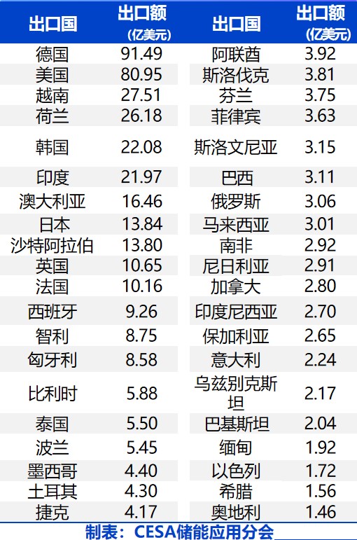 值得關(guān)注的是,從2025年5月份開始,德國已經(jīng)取代美國成為中國鋰離子電池第一大出口市場,1-8月出口額為91.49億美元,同比增長30.59%,占中國鋰離子出口總額的18.9%。第二大市場為美國,1-8月出口總金額為80.95億美元,同比下降7.69%,占比16.8%。越南為第三大出口市場,出口金額為27.51億美元,同比增長9.32%,占比5.7%。前十大出口國家中,同比增幅最大的國家有沙特阿拉伯、智利、澳大利亞。