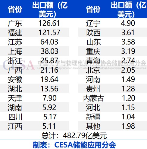 據(jù)CESA儲能應(yīng)用分會不完全統(tǒng)計,2025年1-8月,廣東成為中國鋰離子電池出口產(chǎn)品的最大來源地,出口金額為126.61億美元,同比增長39.7%,占中國鋰離子電池出口額的26.2%。福建位居第二,出口金額為121.57億美元,同比增加17.95%,占比25.2%。江蘇排名第三,出口額為64.03億美元,同比增長3.81%,占比13.3%。福建、廣東和江蘇三省的鋰離子電池出口額占到全國鋰離子電池出口額的64.7%。出口金額增幅最大的三個省分別是湖北、湖南、廣西,出口額分別增長105.39%、86.13%和80.93%。出口數(shù)量增幅最大的三個省市分別為廣西、湖南、福建,出口數(shù)量分別增長了10.97%、46.79%和29.6%。