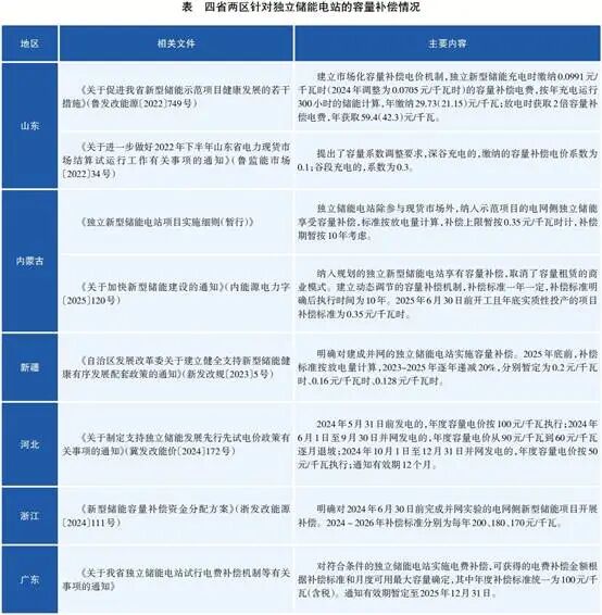 根據(jù)中央政策的相關要求,各地結合地區(qū)自身特點,推出了差異化的獨立儲能容量補償政策,目前山東、內蒙古出臺了相對市場化的長效容量補償電價機制,新疆、河北和浙江等省區(qū)則通過政策文件明確了若干年內針對新型儲能的容量補償標準,廣東就獨立儲能試行電費補償機制征求意見(四省兩區(qū)的補償機制詳見表)。