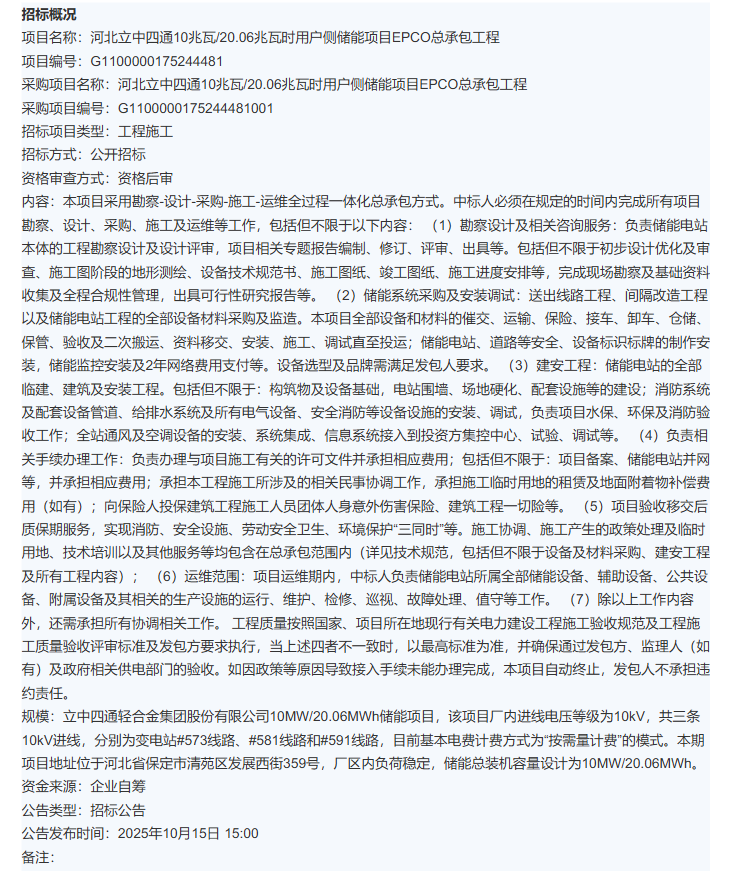 中國儲能網(wǎng)訊:10月15日,中開新能源(深圳)有限公司發(fā)布河北立中四通10兆瓦/20.06兆瓦時用戶側(cè)儲能項目EPCO總承包工程招標(biāo)公告,本項目采用勘察-設(shè)計-采購-施工-運(yùn)維全過程一體化總承包方式。中標(biāo)人必須在規(guī)定的時間內(nèi)完成所有項目勘察、設(shè)計、采購、施工及運(yùn)維等工作。