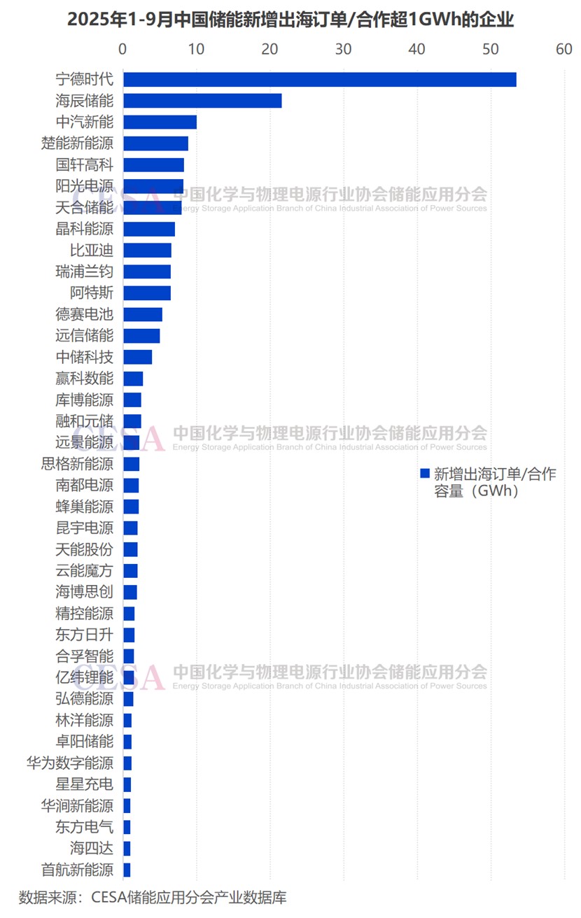 據(jù)CESA儲(chǔ)能應(yīng)用分會(huì)數(shù)據(jù)庫統(tǒng)計(jì),2025年1-9月,中國儲(chǔ)能新增出海訂單/合作總規(guī)模達(dá)214.7GWh,同比增長(zhǎng)131.75%。其中,海外訂單在5GWh以上的企業(yè)分別是:寧德時(shí)代53.51GWh、海辰儲(chǔ)能21.57GWh、中汽新能10.05GWh、楚能新能源8.84GWh、國軒高科8.26GWh、陽光電源8.25GWh、天合儲(chǔ)能7.97GWh、晶科能源7.06GWh、比亞迪6.54GW、瑞浦蘭鈞6.50GWh、阿特斯6.45GWh、德賽電池5.33GWh、遠(yuǎn)信儲(chǔ)能5.00GWh,海外訂單在1GWh以上的企業(yè)就更多了。