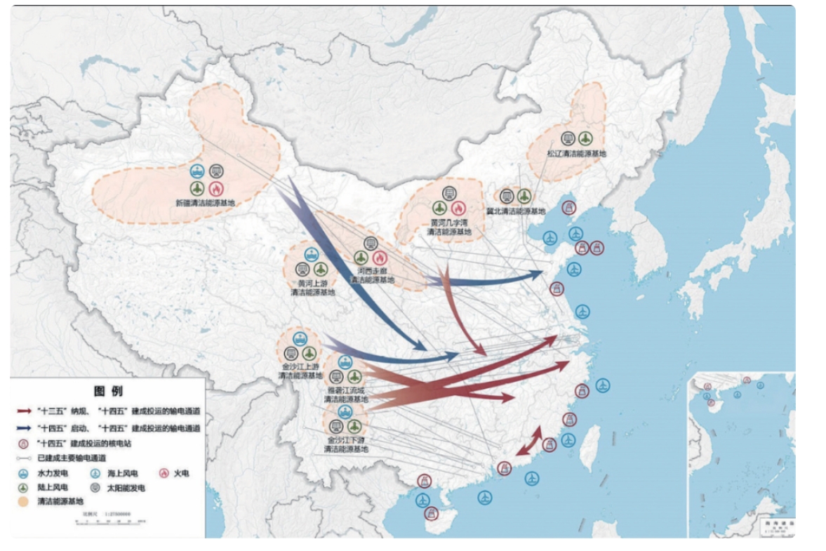 新疆戈壁灘上,巨型風(fēng)電葉片正迎風(fēng)轉(zhuǎn)動(dòng),將動(dòng)能轉(zhuǎn)化為清潔電能;金沙江畔,三峽集團(tuán)的水電站機(jī)組轟鳴,江水奔涌間點(diǎn)亮長(zhǎng)三角的萬(wàn)家燈火;東南沿海核電基地里,“華龍一號(hào)”機(jī)組平穩(wěn)運(yùn)行,為大灣區(qū)產(chǎn)業(yè)引擎持續(xù)輸送能量……這一幅幅場(chǎng)景,是“十四五”大型清潔能源基地布局示意圖(以下簡(jiǎn)稱“示意圖”)中的生動(dòng)寫照。