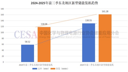 東北地區(qū)作為我國重要的能源基地,擁有豐富的風(fēng)光資源,新能源裝機(jī)規(guī)模持續(xù)增長。據(jù)CESA儲(chǔ)能應(yīng)用分會(huì)產(chǎn)業(yè)數(shù)據(jù)庫不完全統(tǒng)計(jì),2025年前三季度我國東北地區(qū)新型儲(chǔ)能裝機(jī)規(guī)模為130.55MW/161.28MWh,同比增長123%(功率)/36.6%(容量)。