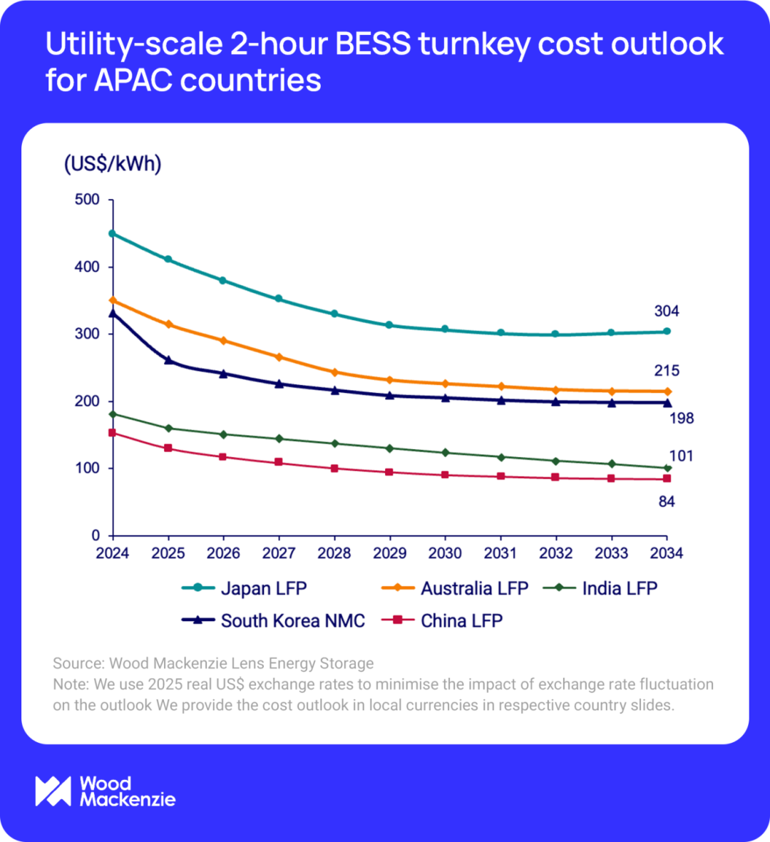 中國將持續(xù)主導(dǎo)亞太地區(qū)電網(wǎng)電池儲(chǔ)能系統(tǒng)(BESS)最低成本,高度的國內(nèi)競爭環(huán)境推動(dòng)電池模組成本在2025年繼續(xù)下降28%,至每千瓦時(shí)40美元。在儲(chǔ)能變流器(PCS)、電池管理系統(tǒng)(BMS)等其它供應(yīng)鏈核心環(huán)節(jié),中國制造商的競爭態(tài)勢依舊激烈,預(yù)計(jì)短期內(nèi)價(jià)格下行趨勢將持續(xù)。到2034年,中國BESS項(xiàng)目成本將下降35%,至每千瓦時(shí)84美元。