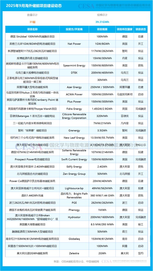 中國儲能網(wǎng)訊:2025年9月,CESA儲能應(yīng)用分會產(chǎn)業(yè)數(shù)據(jù)庫追蹤到31起海外儲能項目建設(shè)動態(tài)事件,總規(guī)模為39.31GWh,涉及Nat Power、Spearmint Energy、DTEK、Azer Energy、ACWA Power、Plus Power、Fidra Energy、Grenergy、New Leaf Energy、PGE、Phenogy、Hydrostor、Globeleq、Zelestra等全球能源投資方/開發(fā)商,建設(shè)地點位于澳大利亞、美國、德國、烏克蘭、英國、智利、阿曼、阿塞拜疆、北馬其頓、波蘭、丹麥等國家。