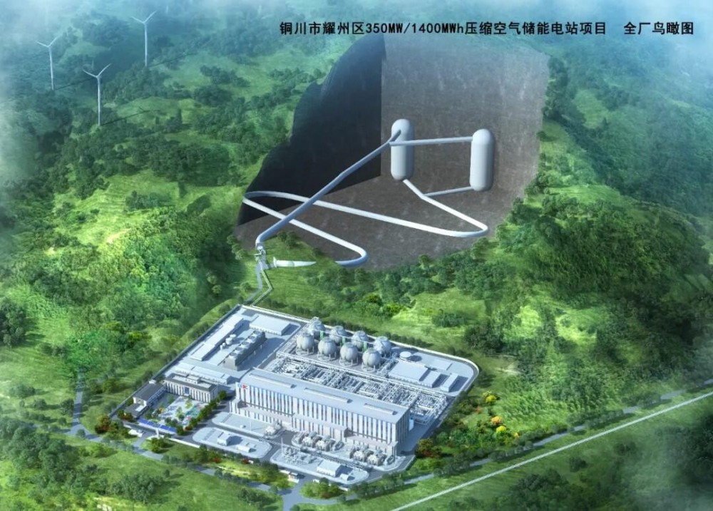 該項目位于陜西省銅川市耀州區(qū),是世界首例在石灰?guī)r地層選址及世界首臺大罐式350兆瓦級人工硐室壓縮空氣儲能電站項目。儲能容量達1400兆瓦時,儲能6小時,釋能4小時,計劃日“兩充兩放”,年運行天數(shù)達330天,年最大發(fā)電量約9.24億度。