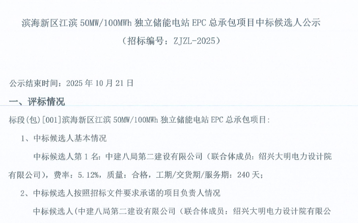 中國儲能網(wǎng)訊:10月16日,紹興濱海新區(qū)濱耀儲能有限公司發(fā)布濱海新區(qū)江濱50MW/100MWh獨立儲能電站EPC總承包項目中標候選人公示。中標候選人第一名為中建八局第二建設有限公司(聯(lián)合體成員:紹興大明電力設計院有限公司),投標費率5.12%,項目總投資12308.65萬元,相當于投標報價11,678.44712萬元,折合單價1.168元/Wh。