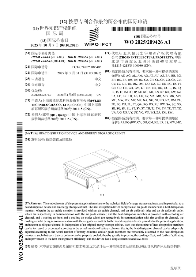 中國(guó)儲(chǔ)能網(wǎng)訊:證券之星消息,根據(jù)企查查數(shù)據(jù)顯示派能科技(688063)公布了一項(xiàng)國(guó)際專(zhuān)利申請(qǐng),專(zhuān)利名為“散熱裝置及儲(chǔ)能柜”,專(zhuān)利申請(qǐng)?zhí)枮镻CT/CN2025/086405,國(guó)際公布日為2025年10月9日。