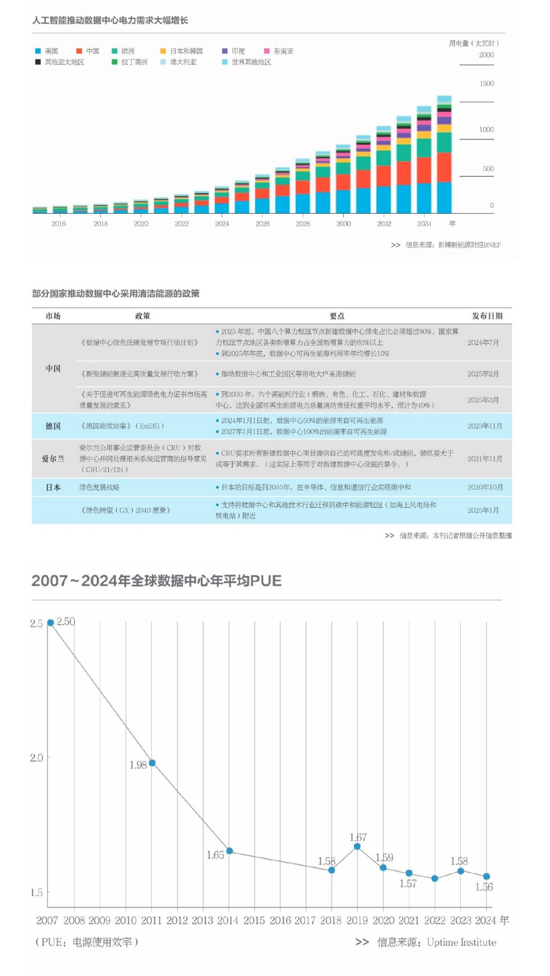 全球算力綠色化約束政策逐漸收緊。德國《能源效率法案》提出針對電源使用效率(PUE)和余熱回收的指標(biāo)體系,要求數(shù)據(jù)中心從2024年開始至少50%的用電來自可再生能源,從2027年開始用電100%來自可再生能源。日本在半導(dǎo)體領(lǐng)域?qū)嵤┬阅芄谋葟娭茦?biāo)準(zhǔn),要求2025年后生產(chǎn)的AI加速芯片每瓦特算力提升不低于15%。愛爾蘭也制定了新建數(shù)據(jù)中心的相關(guān)禁令。歐盟通過碳邊境調(diào)節(jié)機制(CBAM)將數(shù)字服務(wù)碳排放納入核算,倒逼亞馬遜、微軟等出口企業(yè)購買綠電,提前完成100%綠電轉(zhuǎn)型。