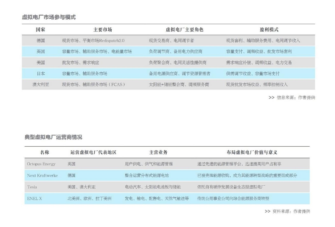最后,各國建立了引導(dǎo)虛擬電廠運(yùn)行的市場(chǎng)機(jī)制。德國電力市場(chǎng)以“平衡單元”機(jī)制為核心,虛擬電廠可參與日前市場(chǎng)、日內(nèi)市場(chǎng)、輔助服務(wù)市場(chǎng)及再調(diào)度2.0(Redispatch 2.0),獲取調(diào)節(jié)補(bǔ)償;英國構(gòu)建容量市場(chǎng)、輔助服務(wù)市場(chǎng)與零售電價(jià)機(jī)制,鼓勵(lì)虛擬電廠參與容量投標(biāo)和頻率響應(yīng)等服務(wù)。美國PJM、CAISO等區(qū)域市場(chǎng)中,虛擬電廠通過需求響應(yīng)和現(xiàn)貨競(jìng)價(jià)參與市場(chǎng)。澳大利亞國家電力市場(chǎng)(NEM)統(tǒng)一現(xiàn)貨與輔助服務(wù)出清,虛擬電廠可進(jìn)入能量與頻率控制輔助服務(wù)(FCAS)市場(chǎng),已在南澳形成成熟的光儲(chǔ)聚合示范。各國建設(shè)虛擬電廠的目標(biāo)不同,市場(chǎng)機(jī)制建設(shè)也各有側(cè)重,應(yīng)以多樣化的市場(chǎng)機(jī)制引導(dǎo)虛擬電廠的運(yùn)行,充分發(fā)揮其靈活性和經(jīng)濟(jì)性,促進(jìn)其在電力市場(chǎng)中的有效參與。