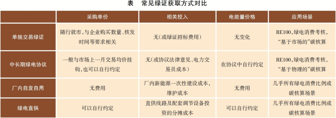 二是結(jié)合企業(yè)需求與資源條件,合理選擇綠電消費(fèi)方式。2025年,電力消納責(zé)任權(quán)重文件提出“核算以綠證為主”。部分企業(yè)可能誤解為,唯有通過市場(chǎng)采購(gòu)綠證,方可滿足政策要求。事實(shí)上,隨著綠證核發(fā)范圍基本實(shí)現(xiàn)全覆蓋,企業(yè)通過廠內(nèi)自發(fā)自用、綠電協(xié)議、綠電直連等途徑同樣可獲取綠證,各路徑在成本和應(yīng)用場(chǎng)景上存在差異,企業(yè)需綜合衡量利弊后進(jìn)行決策。對(duì)于每年電能費(fèi)用占總成本30%~40%的電解鋁企業(yè)、電能費(fèi)用占比達(dá)10%~30%的化工企業(yè)、水泥企業(yè)等,可優(yōu)先考慮利用廠內(nèi)空間自建新能源,或嘗試通過風(fēng)光配儲(chǔ)構(gòu)建綠電直連項(xiàng)目。對(duì)于電能費(fèi)用占比較小的企業(yè),由于當(dāng)前綠證市場(chǎng)均價(jià)僅為電能價(jià)格的1%左右,企業(yè)可結(jié)合低碳發(fā)展階段優(yōu)先選擇采購(gòu)綠證或綠電(見表)。