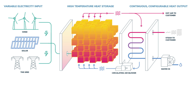 該項目采用Rondo Energy創(chuàng)新研發(fā)的熱電池儲熱技術——以耐火磚為儲熱介質僅由“磚塊和電線”構成。這些經(jīng)過特殊處理的耐火磚,通過電阻加熱可將溫度提升至1000℃以上,實現(xiàn)超過97%的往返效率。熱電池在電價最低的6小時內充電,可利用離網(wǎng)光伏或電網(wǎng)電力,從而大幅降低運行成本。