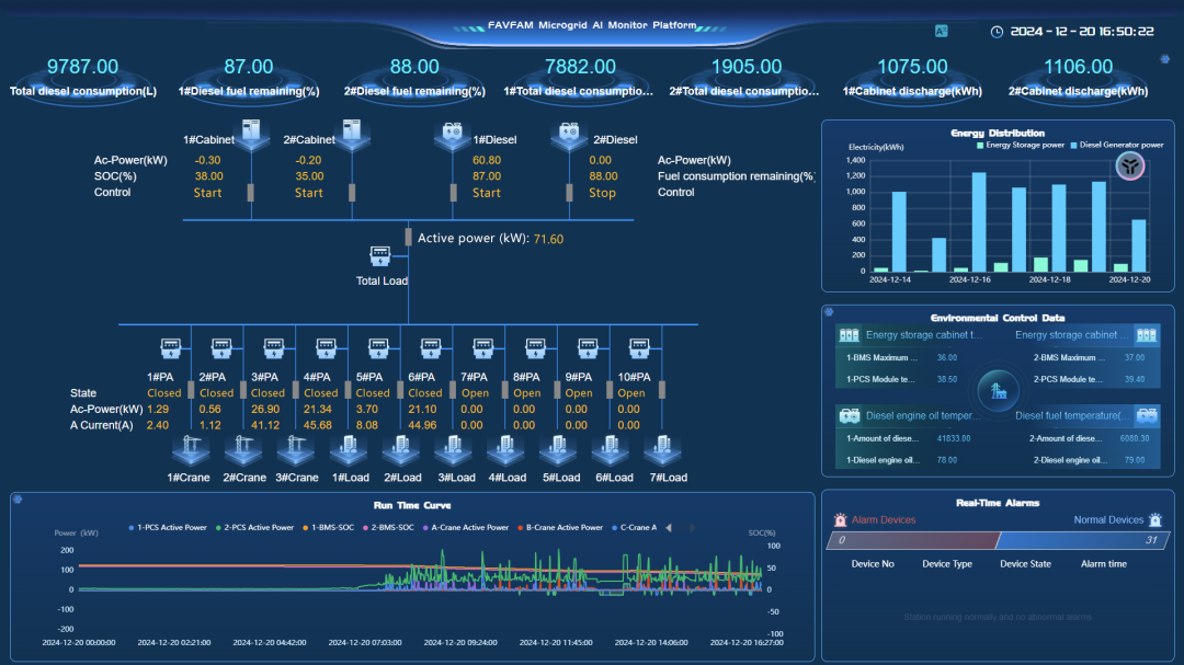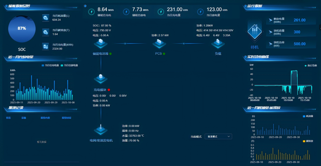 建筑工地的用電負(fù)載波動(dòng)大,傳統(tǒng)柴發(fā)機(jī)組常因“大馬拉小車”導(dǎo)致燃料浪費(fèi)。弘正EMS系統(tǒng)通過(guò)接入儲(chǔ)能、柴發(fā)與電表數(shù)據(jù),實(shí)時(shí)采集運(yùn)行信息,動(dòng)態(tài)調(diào)節(jié)系統(tǒng)狀態(tài)——負(fù)載低時(shí)優(yōu)先用儲(chǔ)能,負(fù)載高時(shí)柴發(fā)智能補(bǔ)能。通過(guò)系統(tǒng)精準(zhǔn)調(diào)度讓工地發(fā)電機(jī)運(yùn)行時(shí)長(zhǎng)大幅縮短,燃料消耗與運(yùn)維成本雙降,在兼顧經(jīng)濟(jì)性與穩(wěn)定性的同時(shí),為工地提供可靠電力保障。