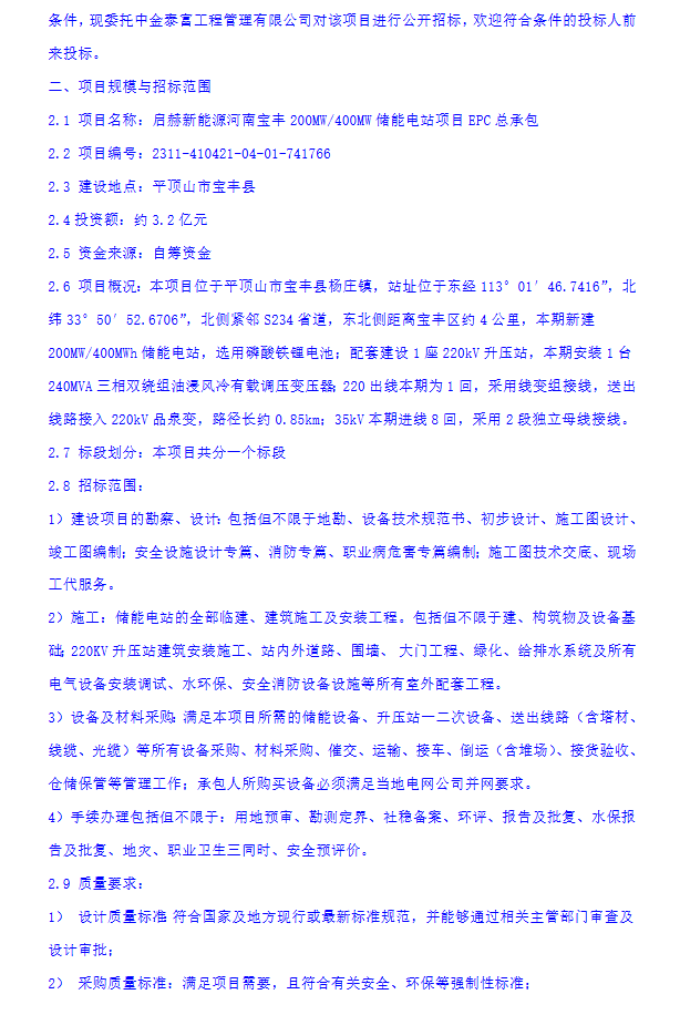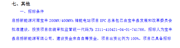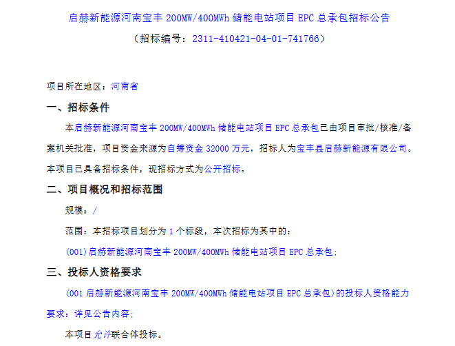 中國儲能網(wǎng)訊:寶豐縣啟赫新能源有限公司發(fā)布河南寶豐200MW/400MWh儲能EPC招標(biāo)公告,項目資金來源為自籌資金32000萬元,約合單價0.8元/Wh,項目位于河南平頂山。