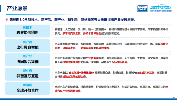此外,《路線圖3.0》從綠色低碳可持續(xù)發(fā)展、安全高效智慧出行、跨界經(jīng)濟(jì)融合發(fā)展、和諧友好汽車社會(huì)四個(gè)方面,提出了汽車產(chǎn)業(yè)未來的社會(huì)愿景,從新技術(shù)、新產(chǎn)品、新產(chǎn)業(yè)、新生態(tài)、新格局等五大維度提出產(chǎn)業(yè)發(fā)展愿景。