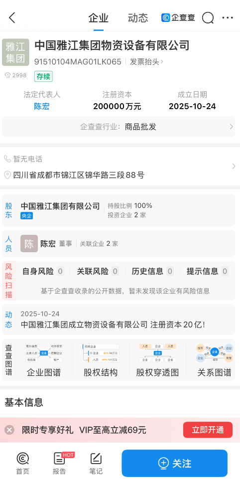 3家公司分別是:中國雅江集團有限公司成都分公司,2025年10月22日注冊成立,注冊地址位于成都市錦江區(qū)錦江大道1666號;中國雅江集團物資設備有限公司、中國雅江集團招標有限公司,均于2025年10月24日注冊成立,注冊地址均位于成都市錦江區(qū)錦華路三段88號。