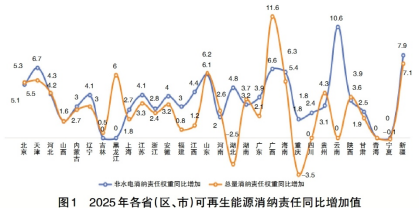 7月1日,國家發(fā)改委辦公廳、國家能源局綜合司聯(lián)合下發(fā)2025年、2026年可再生能源電力消納權重和重點用能行業(yè)綠色電力消費比例,在電解鋁行業(yè)基礎上,2025年增設鋼鐵、水泥、多晶硅行業(yè)和國家樞紐節(jié)點新建數(shù)據(jù)中心綠色電力消費比例。盡管新增的四個行業(yè)2025年僅監(jiān)測不考核,但對重點用能企業(yè)的綠色消費將起到重要的指引與導向作用。從消納責任要求看,各省(區(qū)、市)非水電消納責任權重同比增加0%~10.6%不等(見圖1),其中云南、新疆增加最多,分別增加10.6%與7.9%;吉林、黑龍江、青海、寧夏與2024年持平,全國平均增加約4.1%。非水電消納責任要求的提升可帶動2025年綠電綠證消費量增加超過4000億千瓦時。要注意的是,2025年全年風電、光伏發(fā)電量預計增加超過5000億千瓦時,而跨省區(qū)輸電通道資源緊張,綠電消費量存在區(qū)域錯配問題,單從數(shù)量上看預計多數(shù)地區(qū)綠電消費供過于求的局面仍會維持。