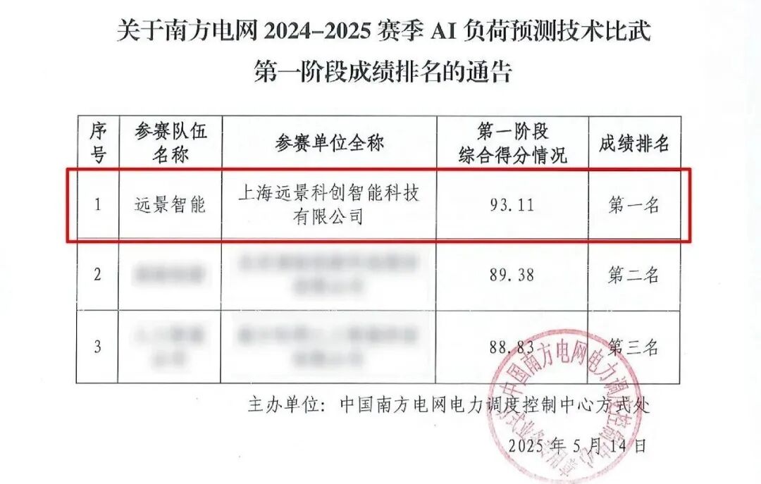 此前,在南方電網(wǎng)公布2024-2025賽季AI負(fù)荷預(yù)測技術(shù)比武第一階段,遠(yuǎn)景與近十家行業(yè)頭部企業(yè)及科研院所展開為期1年的激烈角逐,最終拿下人工智能負(fù)荷預(yù)測與功率預(yù)測雙料冠軍,再次驗證了遠(yuǎn)景卓越的AI能力。