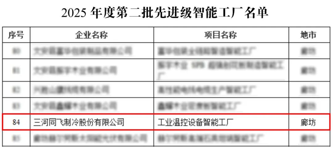 中國(guó)儲(chǔ)能網(wǎng)訊:近日,河北省工業(yè)和信息化廳等六部門聯(lián)合開展的2025年度智能工廠梯度培育行動(dòng)認(rèn)定結(jié)果正式公布,三河同飛制冷股份有限公司(以下簡(jiǎn)稱“同飛股份”)憑借在數(shù)字化轉(zhuǎn)型、智能化升級(jí)領(lǐng)域的先進(jìn)經(jīng)驗(yàn),成功獲評(píng)工業(yè)溫控設(shè)備智能工廠,標(biāo)志著公司智能制造水平達(dá)到國(guó)內(nèi)溫控行業(yè)先進(jìn)標(biāo)準(zhǔn),邁入高質(zhì)量發(fā)展新階段。