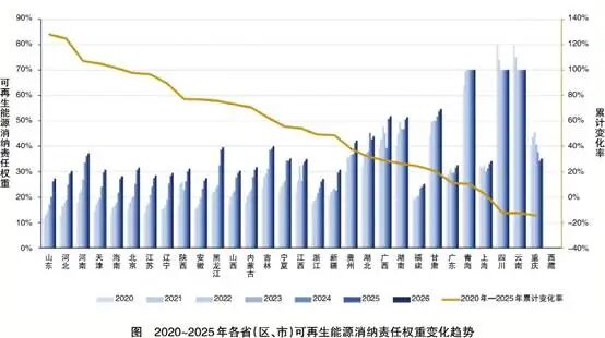 從縱向時(shí)間維度看,各省(區(qū)、市)綠電消費(fèi)指標(biāo)總體呈上升趨勢(shì)。2020年至2025年間,可再生能源消納責(zé)任權(quán)重累計(jì)變化幅度在-15%到128%之間,其中,相對(duì)增長(zhǎng)幅度最高的為山東、河北、河南、天津、海南。西南水電大省可再生能源占比較高,可再生能源電力消納責(zé)任權(quán)重存在一定波動(dòng)。