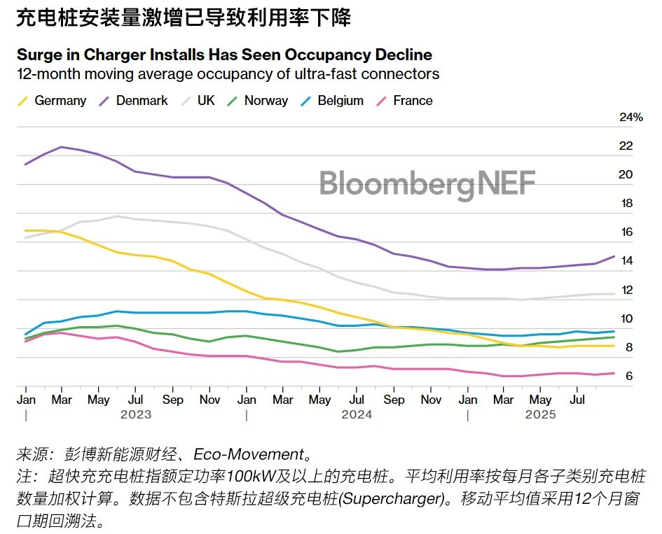 歐洲主要市場(chǎng)的充電樁利用率(即充電樁連接車輛的時(shí)長)普遍下降,超快充充電樁尤為顯著。安裝量激增導(dǎo)致了這一下滑,超快充網(wǎng)絡(luò)的擴(kuò)張速度已超過新能源汽車保有量增速。