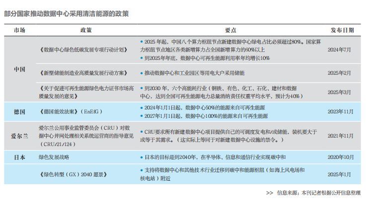全球算力綠色化約束政策逐漸收緊。德國《能源效率法案》提出針對電源使用效率(PUE)和余熱回收的指標(biāo)體系,要求數(shù)據(jù)中心從2024年開始至少50%的用電來自可再生能源,從2027年開始用電100%來自可再生能源。日本在半導(dǎo)體領(lǐng)域?qū)嵤┬阅芄谋葟?qiáng)制標(biāo)準(zhǔn),要求2025年后生產(chǎn)的AI加速芯片每瓦特算力提升不低于15%。愛爾蘭也制定了新建數(shù)據(jù)中心的相關(guān)禁令。歐盟通過碳邊境調(diào)節(jié)機(jī)制(CBAM)將數(shù)字服務(wù)碳排放納入核算,倒逼亞馬遜、微軟等出口企業(yè)購買綠電,提前完成100%綠電轉(zhuǎn)型。