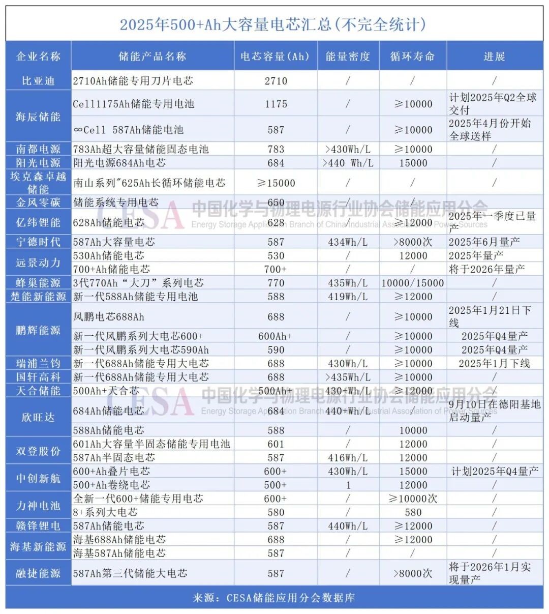 據(jù)CESA儲(chǔ)能應(yīng)用分會(huì)產(chǎn)業(yè)數(shù)據(jù)庫(kù)不完全統(tǒng)計(jì),2024年以來(lái),市場(chǎng)上出現(xiàn)了數(shù)十種500Ah+電芯,僅2025年至今,有超22家企業(yè)發(fā)布31款500Ah+大容量?jī)?chǔ)能電芯。