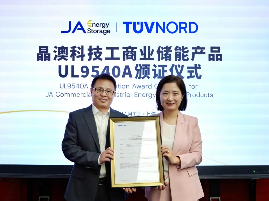 UL 9540A:2025認(rèn)證是全球儲(chǔ)能系統(tǒng)安全領(lǐng)域的重要標(biāo)準(zhǔn)之一,聚焦于儲(chǔ)能產(chǎn)品的熱失控風(fēng)險(xiǎn)評(píng)估和控制電氣打火以及可燃性氣體濃度驗(yàn)證。晶澳科技的工商業(yè)儲(chǔ)能產(chǎn)品在經(jīng)過(guò)嚴(yán)格的熱失控蔓延測(cè)試,順利通過(guò)該項(xiàng)認(rèn)證。這不僅印證了產(chǎn)品的高質(zhì)量與高可靠性,也為晶澳科技在國(guó)際市場(chǎng)上樹(shù)立了更加堅(jiān)實(shí)的品牌信譽(yù)。TüV NORD作為國(guó)際權(quán)威認(rèn)證機(jī)構(gòu),其認(rèn)證為晶澳科技儲(chǔ)能產(chǎn)品的全球市場(chǎng)拓展提供了有力支撐,進(jìn)一步提升了客戶對(duì)晶澳儲(chǔ)能產(chǎn)品的信任度。
