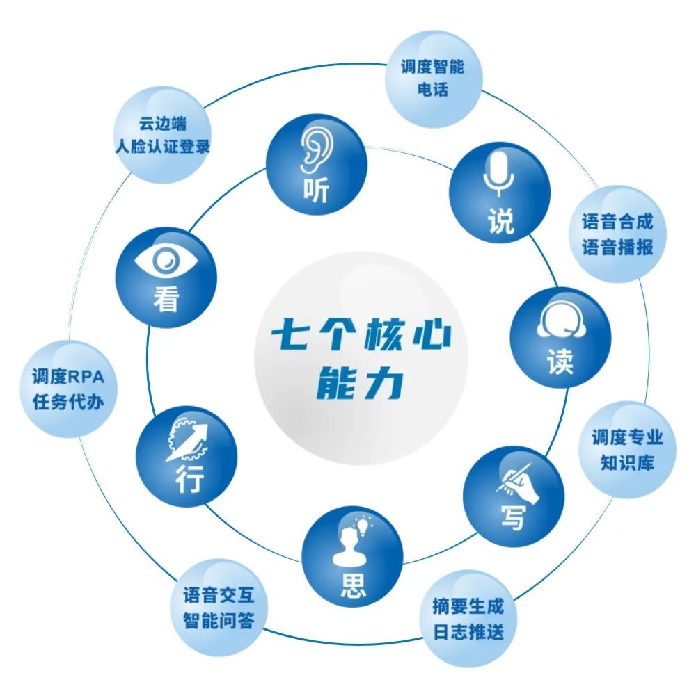 “智能終端”具備“聽、說、讀、寫、思、行、看”七大能力,覆蓋“電話轉(zhuǎn)寫、電話通話、電話摘要、代辦管理、人臉登錄、日志生成、交互問答、RPA任務(wù)”八大調(diào)度場景,全面解決傳統(tǒng)調(diào)度痛點(diǎn)。