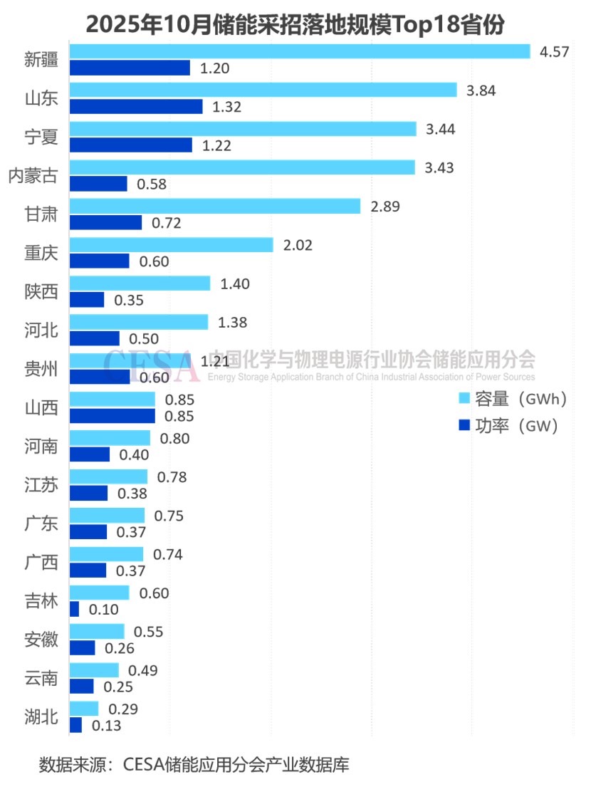 10月,儲能(含直流側(cè)設(shè)備)采招落地前四名省份分別是:新疆、山東、寧夏、內(nèi)蒙古,儲能(含直流側(cè)設(shè)備)采招落地容量均超3GWh。