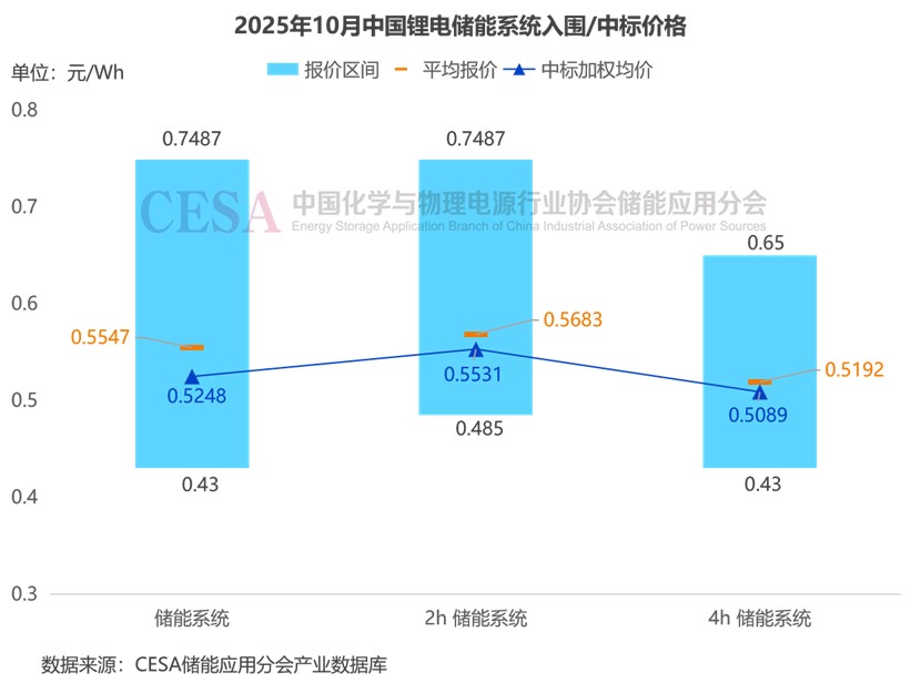 2025年10月,磷酸鐵鋰電池儲能系統(tǒng)(不含工商業(yè)儲能柜)入圍報價主要集中在 0.43-0.7487元/Wh區(qū)間內(nèi),平均報價0.5547元/Wh,中標(biāo)加權(quán)均價0.5248元/Wh,環(huán)比+10%。