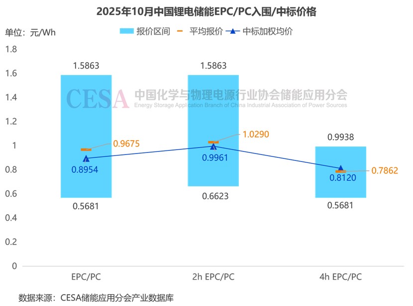 2025年10月,磷酸鐵鋰電池儲能EPC/PC(不含工商業(yè)儲能柜EPC/PC)入圍報價主要集中在0.5681-1.5863元/Wh區(qū)間內(nèi),平均報價0.9675 元/Wh,中標(biāo)加權(quán)均價0.8954元/Wh,環(huán)比-9.49%。