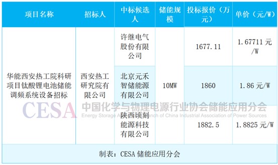 10月,華能西安熱工院科研項目鈦酸鋰電池儲能調(diào)頻系統(tǒng)設(shè)備采招項目開標(biāo),本次招標(biāo)采購10MW鈦酸鋰電池儲能調(diào)頻系統(tǒng),許繼電氣以1677.11萬元的報價中標(biāo),中標(biāo)單價1.67711元/W。