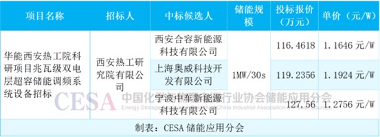 10月,華能西安熱工院科研項目兆瓦級雙電層超容儲能調(diào)頻系統(tǒng)設(shè)備采招項目開標(biāo),該項目采購1MW/30s雙電層超容直流預(yù)制艙以及設(shè)備配套冷卻系統(tǒng)、消防系統(tǒng)、視頻監(jiān)控系統(tǒng)、電氣一次及二次部件、電纜等附屬設(shè)備。西安合容新能源科技有限公司以116.4618萬元的報價中標(biāo),中標(biāo)單價1.1646元/W。