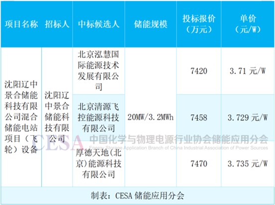 10月,沈陽遼中景合儲能科技有限公司混合儲能電站項目(飛輪)設(shè)備采招落地,北京泓慧國際能源技術(shù)發(fā)展有限公司以7420萬元的報價中標(biāo),中標(biāo)單價3.71元/W。