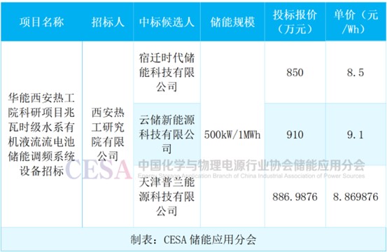 10月,華能西安熱工院科研項目兆瓦時級水系有機夜流電池儲能調(diào)頻系統(tǒng)設(shè)備采招落地,宿遷時代儲能以850萬元的報價中標(biāo),中標(biāo)單價8.5元/Wh。