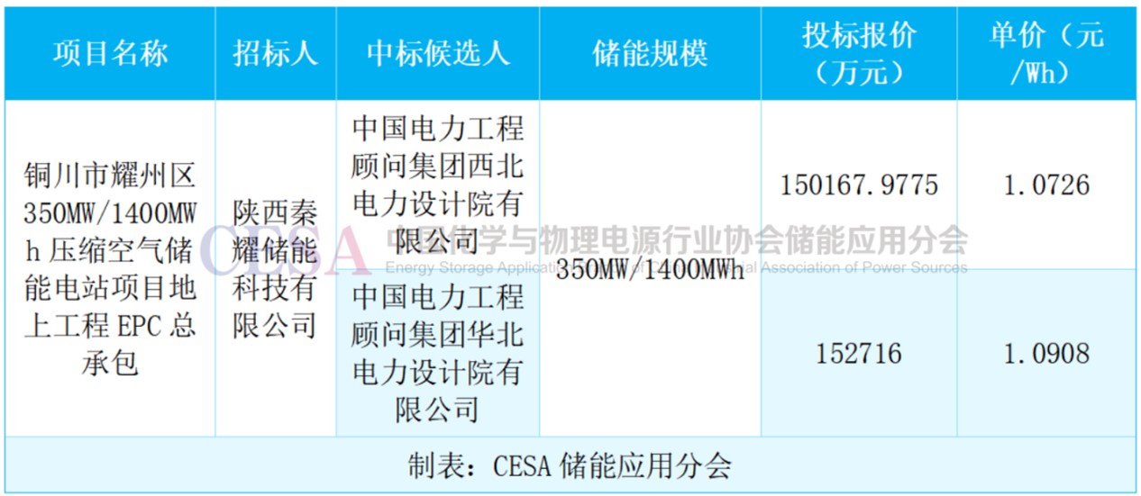 10月,陜西省銅川市耀州區(qū)350MW/1400MWh壓縮空氣儲能電站項目地上工程EPC總承包采招落地,中能建西北院以15.0168億元中標(biāo),中標(biāo)單價1.0726元/Wh。