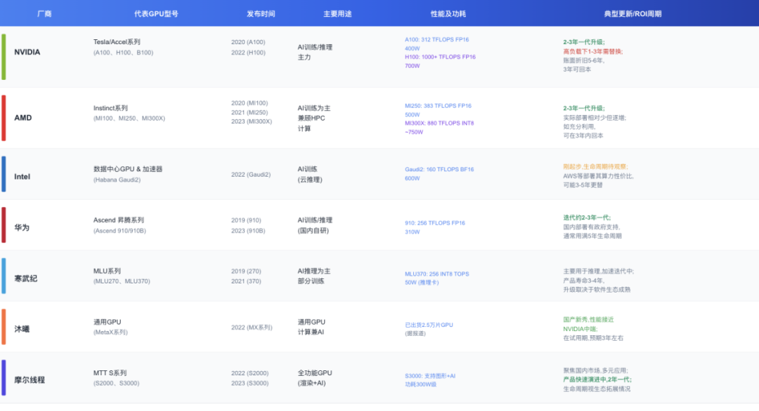 總之,GPU作為AI時代數(shù)據(jù)中心的核心資產(chǎn),其折舊和評估需要動態(tài)權(quán)衡技術(shù)演進和經(jīng)濟回報。對于高端GPU,3年前后即進入更新窗口,高負載環(huán)境甚至更短;數(shù)據(jù)中心整體資產(chǎn)評估則融合了財務折舊和算力價值視角,既看設備賬面生命周期,也看其在不斷變化的AI市場中的供需價值。