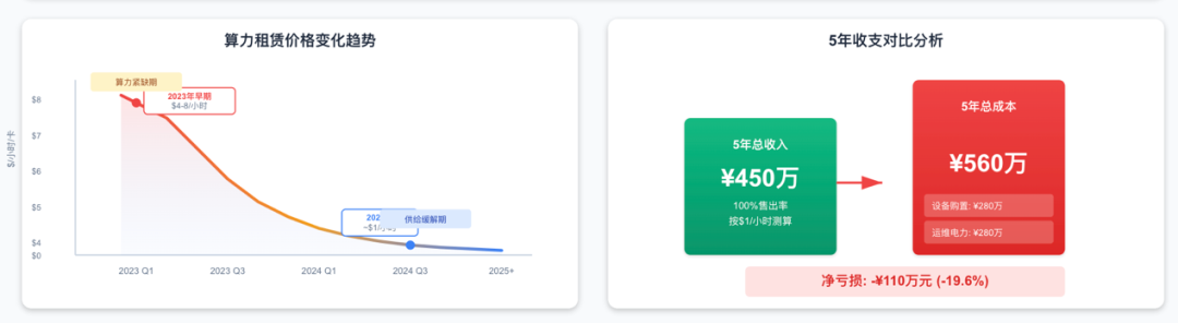 然而隨著2024年供給緩解、算力租賃價格下滑,中期租價降至每卡僅1美元/小時左右,按100%售出率測算5年總收入約¥450萬,扣除設備與機房等成本(約¥560萬,含服務器購置和5年運維電力等附加成本,五年反而虧損約¥110萬。直線折舊法下前兩年盈利、第三年開始虧損的現(xiàn)象表明:GPU資產(chǎn)的經(jīng)濟壽命通常小于賬面折舊年限。