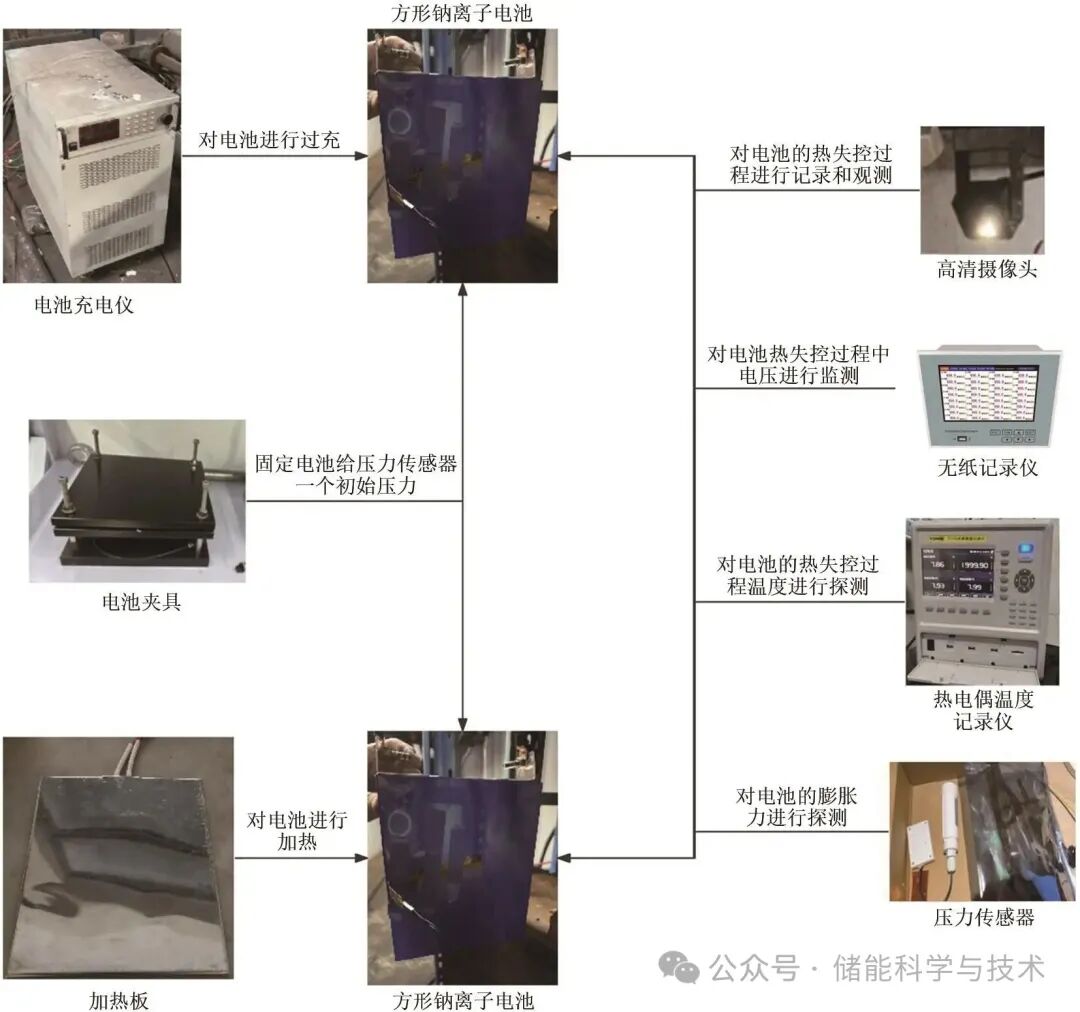 目前對(duì)鈉離子電池安全性的研究主要關(guān)注其熱行為特性。Li等探究了鈉離子電池中帶電層狀氧化物正極的熱分解機(jī)制,發(fā)現(xiàn)鋰摻雜通過(guò)抑制過(guò)渡金屬離子溶出和減少氧氣釋放,有效提升了熱穩(wěn)定性。他們建立的動(dòng)力學(xué)三要素模型為開發(fā)更安全的電池材料提供了理論基礎(chǔ)。Rui等通過(guò)球形壓痕測(cè)試結(jié)合多物理場(chǎng)計(jì)算模型,研究了鈉離子電池在機(jī)械濫用條件下的安全性能與失效機(jī)制。研究表明,與鋰離子電池相比,鈉離子電池呈現(xiàn)出較緩慢的內(nèi)短路觸發(fā)過(guò)程和顯著較低的內(nèi)短路溫度,證實(shí)其在機(jī)械負(fù)載下具有更高的安全邊際。Li等系統(tǒng)比較了鈉離子電池與鋰離子電池在不同加熱功率下的熱失控行為,發(fā)現(xiàn)隨著加熱功率增加,鈉離子電池的熱危害顯著增加而氣體產(chǎn)生危害減少。鈉離子電池的整體熱失控危害程度介于NCM523和LFP電池之間,且不會(huì)自發(fā)燃燒,凸顯了鈉基能源存儲(chǔ)系統(tǒng)的研究?jī)r(jià)值。Li等考察了不同荷電狀態(tài)下大型棱柱形鈉離子電池的熱失控行為,發(fā)現(xiàn)較高的荷電狀態(tài)會(huì)導(dǎo)致更嚴(yán)重的熱危害,其中氫氣在排出氣體中的比例高達(dá)42%。研究人員還觀察到一種自熄滅現(xiàn)象,即熱失控過(guò)程中產(chǎn)生的強(qiáng)烈氣體能有效分散熱量并將可燃?xì)怏w與氧氣和火花隔離。Teng等研究了鈉離子電池(SIBs)從材料到電池級(jí)別的熱穩(wěn)定性和安全特性,揭示了固體電解質(zhì)界面(SEI)分解在100 ℃以下就開始發(fā)生,正極材料(NaxNi1/3Fe1/3Mn1/3O2)與電解液之間的反應(yīng)構(gòu)成了熱濫用過(guò)程中的主要放熱事件,且熱量產(chǎn)生與氣體生成行為不一定相關(guān)。Mei等對(duì)鋰離子電池和鈉離子電池的熱安全性進(jìn)行了全面比較,通過(guò)加速量熱儀測(cè)試發(fā)現(xiàn)磷酸鐵鋰(LFP)電池展現(xiàn)出最低的熱失控風(fēng)險(xiǎn)和嚴(yán)重程度,鈉離子電池的熱穩(wěn)定性與LFP相當(dāng),但具有最低的安全排氣溫度和最長(zhǎng)的排氣到熱失控的時(shí)間間隔,有利于及早預(yù)警。總體而言,LFP電池的熱危害最低,其次是鈉離子電池,再次是三元材料(NCM523)電池。然而,這些研究大多局限于單一濫用條件下的表現(xiàn),難以全面反映實(shí)際應(yīng)用中大容量鈉離子電池的熱失控行為特征。不同濫用條件下,如過(guò)熱和過(guò)充等情況下的熱失控機(jī)理和表現(xiàn)形式存在顯著差異,亟需進(jìn)行系統(tǒng)性研究。在實(shí)際應(yīng)用環(huán)境中,鈉離子電池可能面臨多種濫用條件,其中過(guò)熱和過(guò)充是最為常見的兩種情況。過(guò)熱通常源于外部熱源、短路或環(huán)境溫度過(guò)高,而過(guò)充則主要由電池管理系統(tǒng)故障或充電控制失效引起。這兩種濫用條件不僅在觸發(fā)機(jī)制上存在差異,其誘發(fā)的熱失控過(guò)程和表現(xiàn)形式也呈現(xiàn)出明顯不同。目前關(guān)于大容量商用鈉離子電池在這兩種濫用條件下熱失控行為的對(duì)比研究尚不充分,尤其缺乏對(duì)熱失控過(guò)程中溫度分布、電壓變化和膨脹力演變等關(guān)鍵參數(shù)的系統(tǒng)監(jiān)測(cè)與分析。