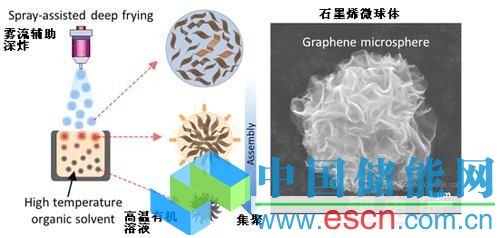 “這一簡單的霧流輔助式石墨烯分子自組裝工藝使用的是高溫有機溶劑,讓人想起油炸食品。” Pratchi Patel在美國《化學化工新聞》中具體描述了他們的成果,稱他們通過將氧化石墨烯噴入高溫溶劑制成了一種圓形類似于絨球的石墨烯微粒。他們的工藝有點像油炸。這一技術(shù)能夠“為制造電池和超級電容器上的電極材料提供一種簡單、通用的方法,并有可能提高蓄電設備的能效和功率密度?!?