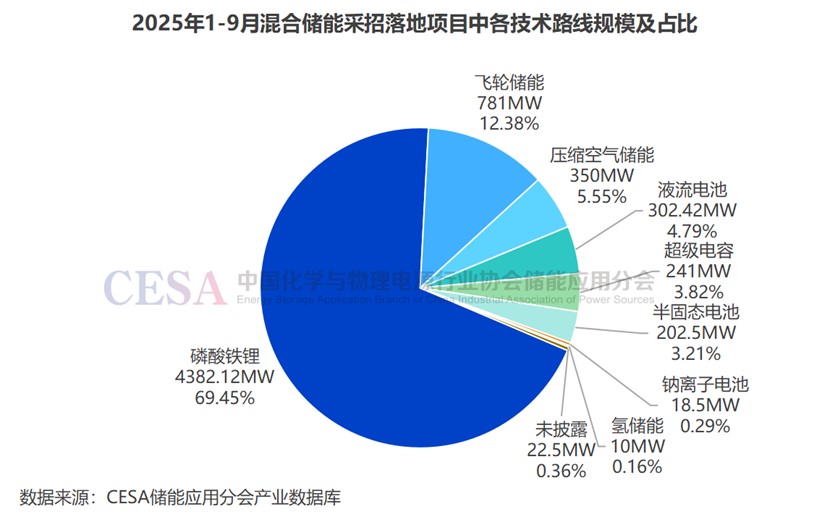 除了已經(jīng)實際落地的項目,從更活躍的招投標市場也能看出混合儲能的重要趨勢及方向。根據(jù)CESA儲能應(yīng)用分會的數(shù)據(jù),2025年1月到9月,混合儲能項目的招投標規(guī)模達到了6.31GW/14.7GWh,分別占總功率和總?cè)萘康?.07%和4.58%。