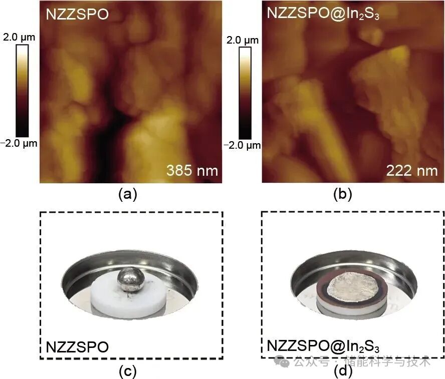 圖2 (a) NZZSPO和 (b) NZZSPO@In2S3固體電解質(zhì)的AFM圖像;熔融鈉在 (c) NZZSPO和 (d) NZZSPO@In2S3固體電解質(zhì)表面的潤(rùn)濕性