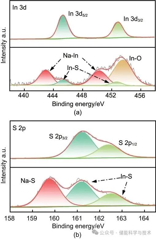 圖3 循環(huán)前后NZZSPO@In2S3固體電解質(zhì)表面的 (a) In 3d和 (b) S 2p XPS譜圖