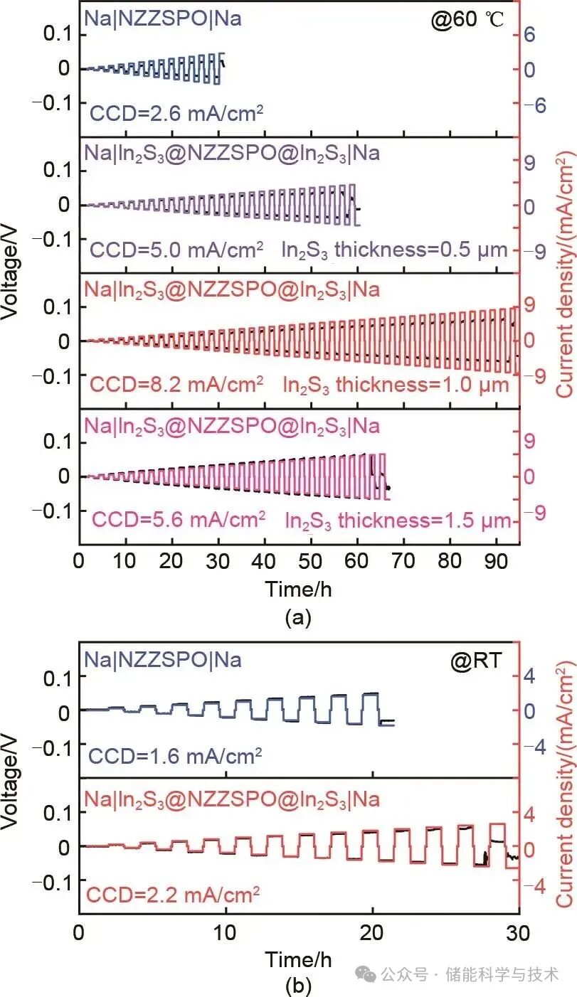 將鈉箔貼附在NZZSPO和NZZSPO@In2S3固體電解質(zhì)的兩側(cè),并在50 MPa的等靜壓下壓制得到對(duì)稱電池。為了測(cè)量臨界電流密度(CCD),這些電池在LAND CT-2001A電池測(cè)試系統(tǒng)上以逐步增加的電流密度進(jìn)行循環(huán)測(cè)試。通過(guò)對(duì)稱電池在不同溫度和電流密度下的恒流充放電循環(huán),評(píng)估其長(zhǎng)循環(huán)穩(wěn)定性。