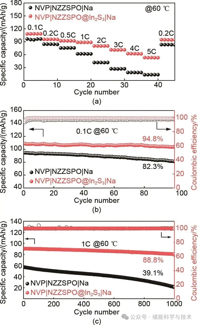 圖6 (a) NVP|NZZSPO|Na和NVP|NZZSPO@In2S3|Na全固態(tài)電池在60 ℃下的倍率性能;60 ℃下,NVP|NZZSPO|Na和NVP|NZZSPO@In2S3|Na全固態(tài)電池在 (b) 0.1C和 (c) 1C下的長(zhǎng)循環(huán)性能